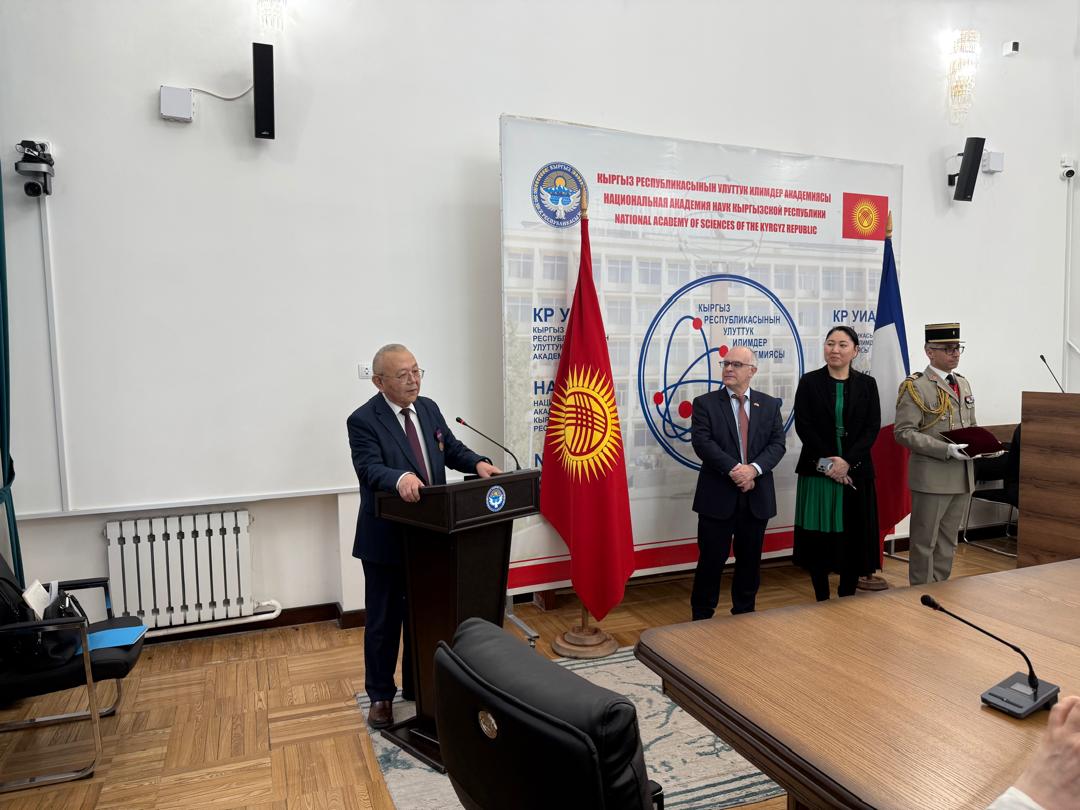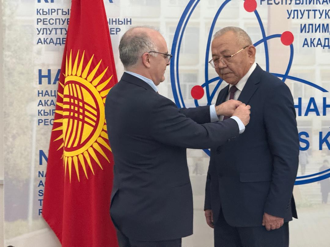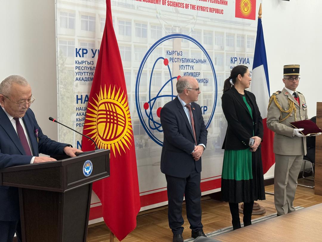 Кечээ, 18-февралда Улуттук илимдер академиясына Франциянын Кыргызстандагы туруктуу жана ыйгарым укуктуу элчиси Николя Фай келинчеги менен кубанычтуу кабар алып келди. Ал 2025-жылдын 1-декабрындагы Франция Куралдуу күчтөрүнүн биомедицинаны изилдөө институтунун директору, башкы инспектор Эрик Валаденин чыгарган чечими боюнча ветеринария илимдеринин доктору, профессор, академик, УИАнын Биотехнология институтунун директору Асанкадыр Жунушовго саламаттыкты сактоого кошкон салымы үчүн улуттук коргоонун коло медалын тапшырды.
